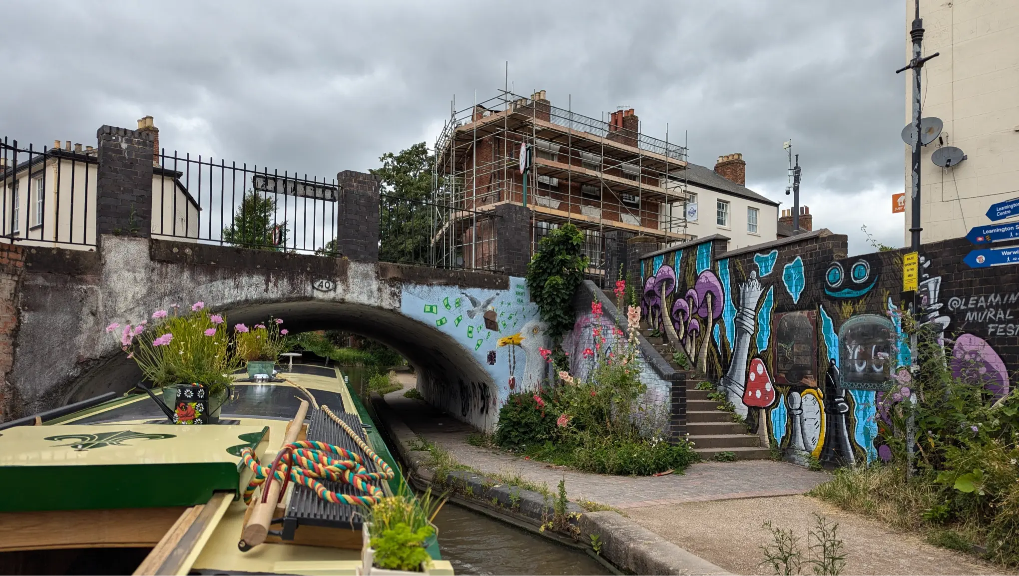 After a short cruise from Radford Semele, we reach the outskirts of Leamington Spa and tie the boat up (on mooring rings) outside the student accommodation. We need a few pieces of shopping so climb the steps beside the bridge, turn right and we are immediately in the town.